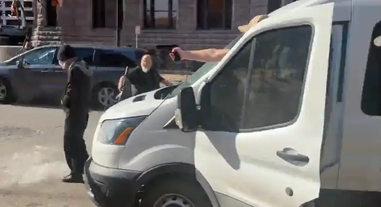 The man who threatened Clark and other observers with the pistol got back into a van with tinted windows as his bearded colleague warned people to get back and fired pepper balls at their feet. Video provided by witnesses and first published on social media shows the van bumping one of the observers as it merged into traffic.